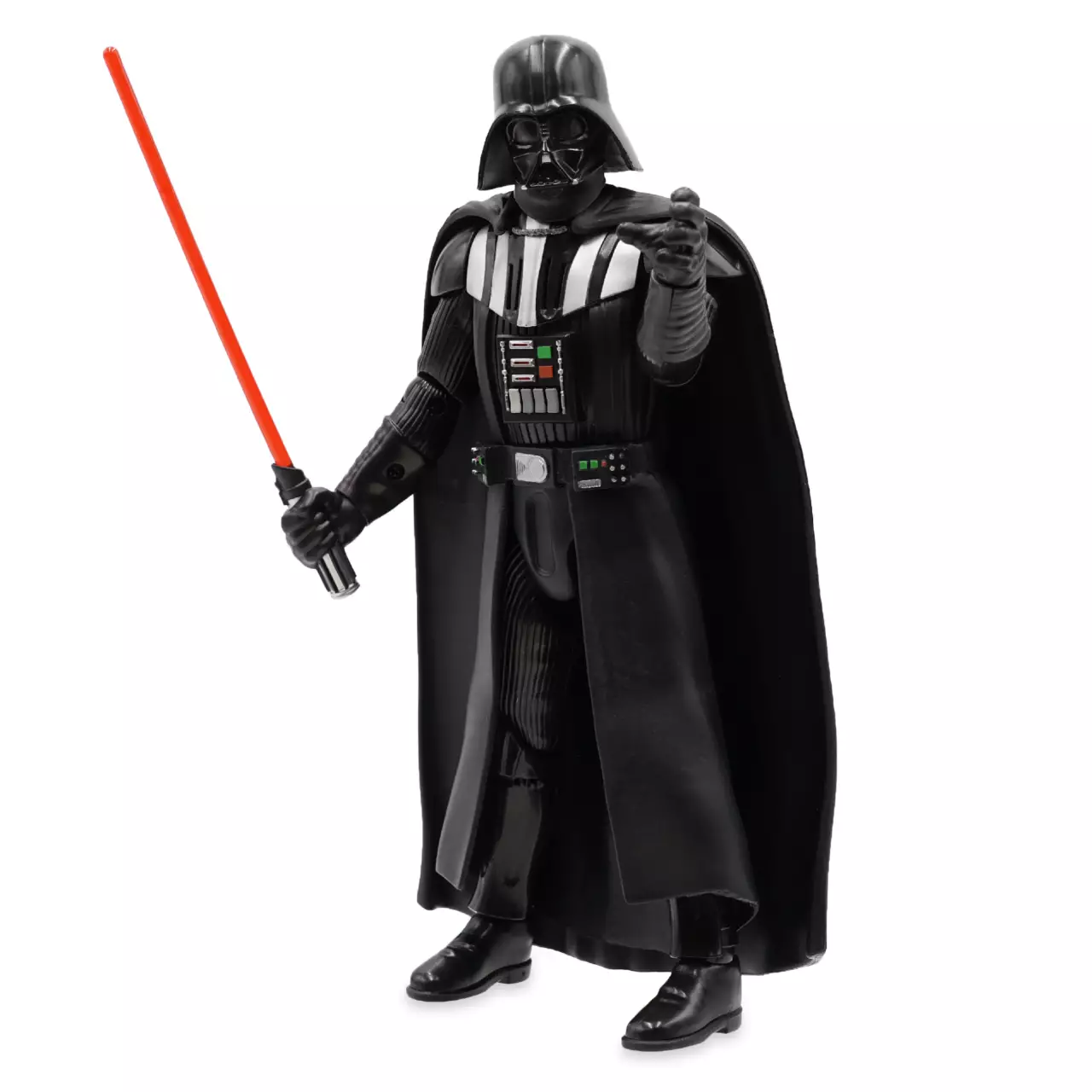Darth Vader el llamativo Sith tiene un sable de luz activado por movimiento con efectos de luz y sonido en una mano y está listo para usar la Fuerza contra todos y cada uno de los rebeldes. Un botón en su pecho activa frases en su icónica voz mecanizada.